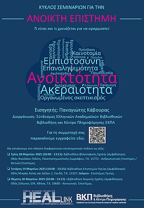 Η Διεύθυνση Βιβλιοθήκης και Κέντρο Πληροφόρησης του ΕΚΠΑ σε συνεργασία με τον Σύνδεσμο Ελληνικών Ακαδημαϊκών Βιβλιοθηκών, στο πλαίσιο του κύκλου σεμιναρίων για την Ανοικτή Επιστήμη του ΣΕΑΒ, διοργανώνει τρία σεμινάρια, διαφορετικών επιστημονικών πεδίων, ως εξής: